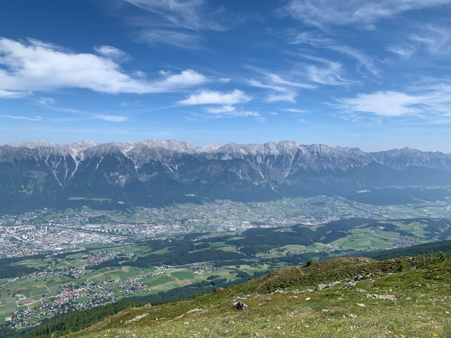 ここからの車窓は圧巻で、眼下に広がるインスブルックの街並みと、その背後にそびえるノルトケッテ連峰のパノラマを一望できました。